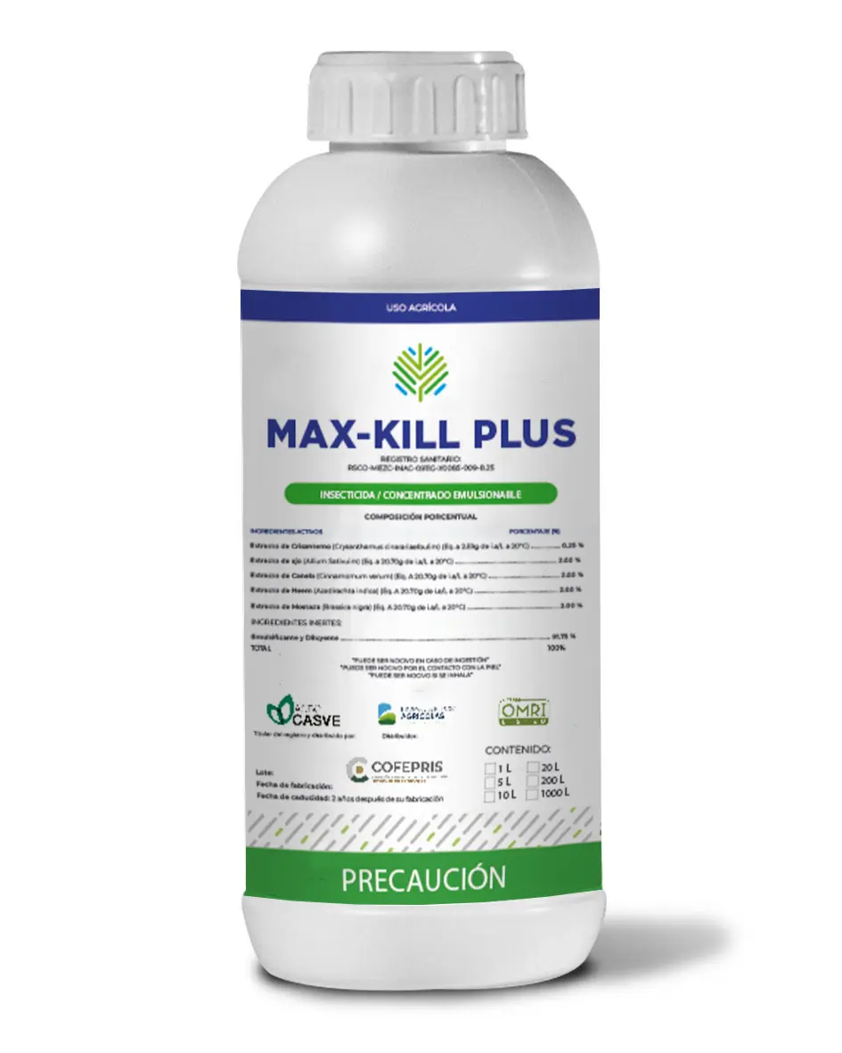 Insecticida orgánico derivado de extractos orgánicos vegetales con diluyentes y surfactantes que son inofensivos para los insectos benéficos en todos los cultivos de hortalizas, granos y frutales.